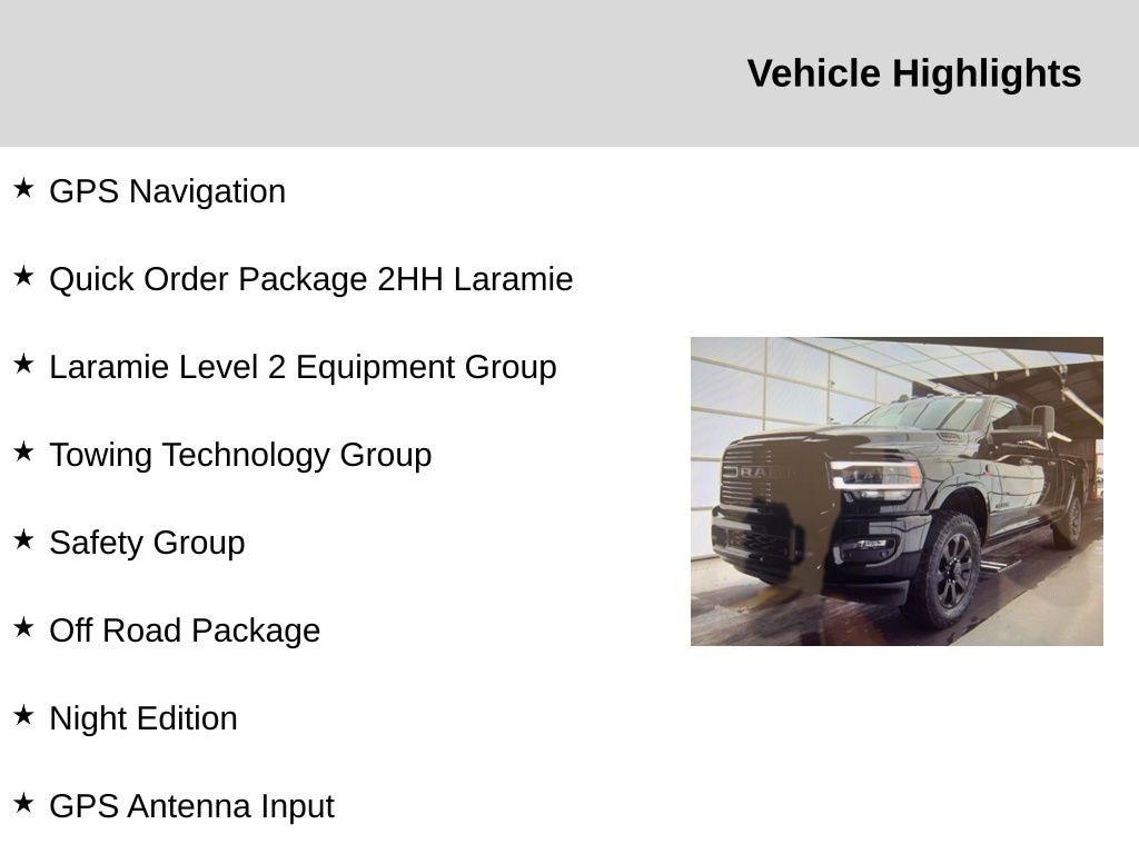 Laramie Level 2 Equipment Group (1-Year SiriusXM Guardian Trial, 17 Speaker harman kardon Premium Sound, 5-Year SiriusXM Traffic Service, 5-Year SiriusXM Travel Link Service, 8.4" Touchscreen Display, Apple CarPlay, Auto High Beam Headlamp Control, Blind Spot & Cross Path Detection, Disassociated Touchscreen Display, Exterior Mirrors w/Memory, Foam Bottle Insert (Door Trim Panel), For Details Visit DriveUconnect.com, Google Android Auto, GPS Antenna Input, GPS Navigation, HD Radio, Heated Second Row Seats, Integrated Center Stack Radio, Integrated Voice Command w/Bluetooth, Media Hub w/2 Charge Only USBs, Mirror-Mounted Aux Reverse Lamps, Power Adjustable Convex Aux Mirrors, Power Adjustable Pedals w/Memory, Pwr Convenience Chrome Tow Mirrors w/Spotter & Memory, Radio: Uconnect 4C Nav w/8.4" Display, Radio/Driver Seat/Mirrors/Pedals Memory, Rain Sensitive Windshield Wipers, Remote Tailgate Release, SiriusXM Satellite Radio, SiriusXM Traffic Plus, SiriusXM Travel Link, USB Host Flip, and Ventilated Front Seats), Night Edition (Black Exterior Mirrors, Black Exterior Truck Badging, Black Headlamp Bezels, Black Interior Accents, Black RAM Head Tailgate Badge, Black Tail Lamp Bezels, Black Wheel Center Hub, Body Color Door Handles, Body Color Grille Surround, Gloss Black Grille Billets/Accents, Painted Front Bumper, Painted Rear Bumper, Pwr Convenience Black Tow Mirrors w/Spotter & Memory, and Wheels: 20" x 8.0" Black Painted Aluminum), Off Road Package (Front Performance Tuned Shock Absorbers, Hill Descent Control, Off Road Decal, and Rear Performance Tuned Shock Absorbers), Quick Order Package 2HH Laramie, Safety Group (Adaptive Cruise Control w/Stop, Adaptive Steering System, Full Speed Forward Collision Warning Plus, and Lane Keep Assist), Towing Technology Group (Center Stop Lamp w/Cargo View Camera, Surround View Camera System, and Trailer Reverse Guidance), #1 Seat Foam Cushion, 10 Speakers, 115V Auxiliary Rear Power Outlet, 12" Touchscreen Display, 2 Way Rear Headrest Seat, 220 Amp Alternator, 3.73 Axle Ratio, 4 Way Front Headrests, 4-Wheel Disc Brakes, 400W Inverter, ABS brakes, Active Noise Control System, Adjustable pedals, Air Conditioning, Alloy wheels, AM/FM radio: SiriusXM, Anti-Spin Differential Rear Axle, Apple CarPlay/Android Auto, Auto-dimming Rear-View mirror, Automatic temperature control, Brake assist, Bumpers: chrome, Center Hub, Clearance Lamps, Compass, Delay-off headlights, Driver door bin, Driver vanity mirror, Dual Alternators Rated At 440 Amps, Dual front impact airbags, Dual front side impact airbags, Electronic Stability Control, Electronically Controlled Throttle, Front & Rear Rubber Floor Mats, Front anti-roll bar, Front Center Armrest w/Storage, Front dual zone A/C, Front fog lights, Front reading lights, Front Seat Back Map Pockets, Fully automatic headlights, Garage door transmitter, Heated door mirrors, Heated Front Seats, Heated front seats, Heated Steering Wheel, Heated steering wheel, High Back Seats, I/P Mounted Auxiliary Switches, Illuminated entry, Leather steering wheel, Leather Trim 40/20/40 Bench Seat, LED Bed Lighting, Low tire pressure warning, Manufacturer's Statement of Origin, Occupant sensing airbag, Outside temperature display, Overhead airbag, Overhead console, Panic alarm, ParkView Rear Back-Up Camera, Passenger door bin, Passenger vanity mirror, Power 2-Way Driver Lumbar Adjust, Power 2-Way Passenger Lumbar Adjust, Power Adjust 8-Way Driver Seat, Power Adjust 8-Way Front Passenger Seat, Power Deployable Running Boards, Power door mirrors, Power driver seat, Power passenger seat, Power steering, Power Sunroof, Power windows, Radio data system, Radio: Uconnect 12 w/Navigation, Radio: Uconnect 4 w/8.4" Display, RamBox Cargo Management System, Rear 60/40 Folding Seat, Rear anti-roll bar, Rear reading lights, Rear seat center armrest, Rear step bumper, Rear window defroste