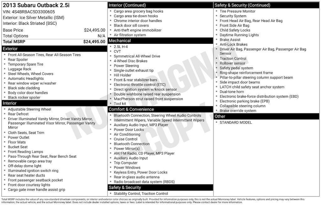 Ice Silver Metallic 2013 Subaru Outback 2.5i AWD CVT Lineartronic 2.5L 4-Cylinder DOHC 16V