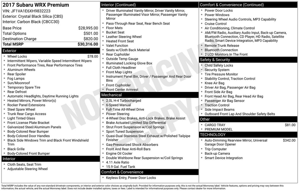 Crystal Black Silica 2017 Subaru WRX Premium AWD 6-Speed Manual 2.0L DOHC Intercooled Turbocharged