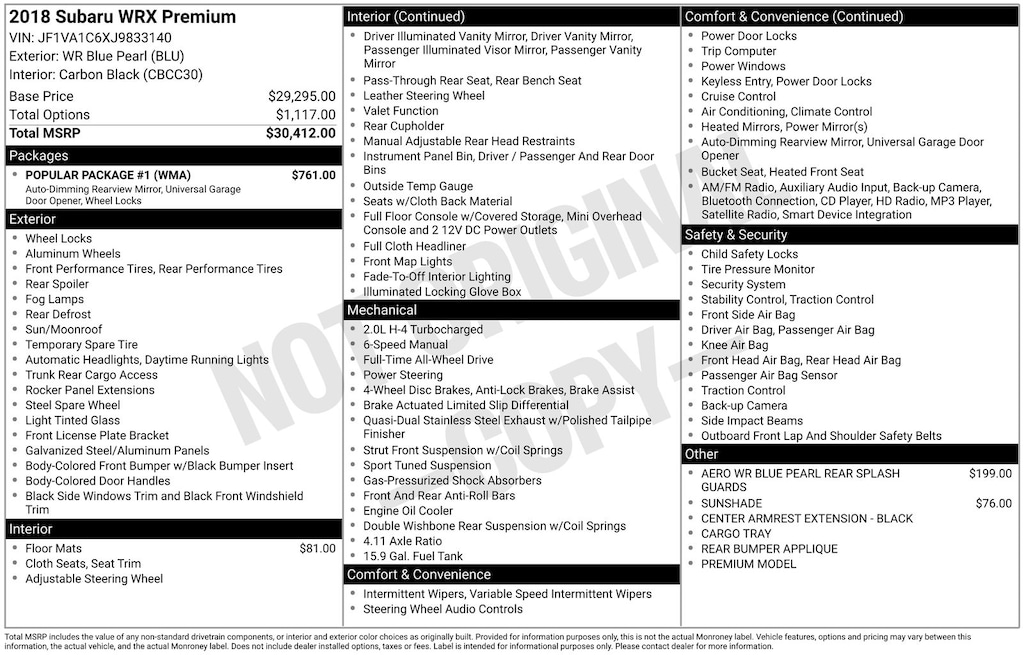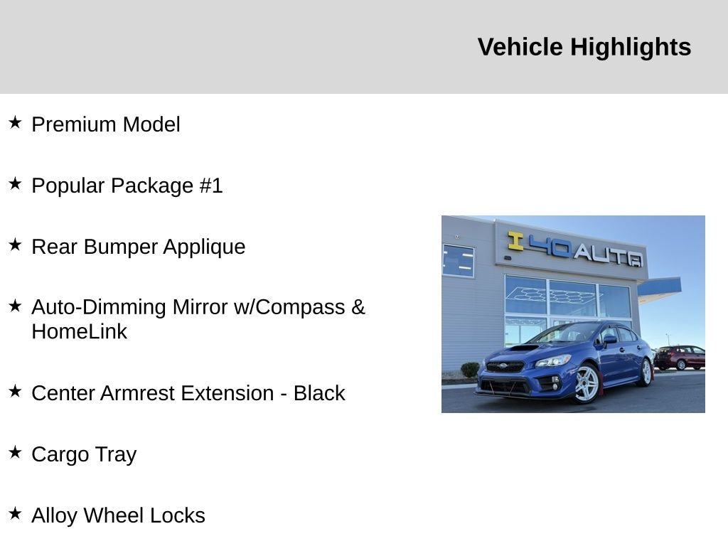 Popular Package #1 (Alloy Wheel Locks, Auto-Dimming Mirror w/Compass & HomeLink, Cargo Tray, Center Armrest Extension - Black, and Rear Bumper Applique), Premium Model, 18" Alloy Wheels, 4-Wheel Disc Brakes, 6 Speakers, ABS brakes, Aero WR Blue Pearl Rear Splash Guards, Air Conditioning, All Weather Floor Mats, Alloy wheels, AM/FM radio: SiriusXM, Automatic temperature control, Brake assist, Bumpers: body-color, CD player, Checkered Cloth Upholstery, Driver door bin, Driver vanity mirror, Dual front impact airbags, Dual front side impact airbags, Electronic Stability Control, Exterior Parking Camera Rear, Four wheel independent suspension, Front anti-roll bar, Front Bucket Seats, Front Center Armrest, Front fog lights, Front reading lights, Heated door mirrors, Heated front seats, Illuminated entry, Knee airbag, Leather Shift Knob, Leather steering wheel, Low tire pressure warning, Occupant sensing airbag, Outside temperature display, Overhead airbag, Overhead console, Panic alarm, Passenger door bin, Passenger vanity mirror, Performance Design Heated Front Bucket Seats, Power door mirrors, Power moonroof, Power steering, Power windows, Radio data system, Radio: Subaru Starlink 7.0" Multimedia Plus System, Rear anti-roll bar, Rear seat center armrest, Rear window defroster, Remote keyless entry, Security system, Speed control, Speed-sensing steering, Split folding rear seat, Spoiler, Sport steering wheel, Steering wheel mounted audio controls, Sunshade, Tachometer, Telescoping steering wheel, Tilt steering wheel, Traction control, Trip computer, and Variably intermittent wipers. 21/27 City/Highway MPG