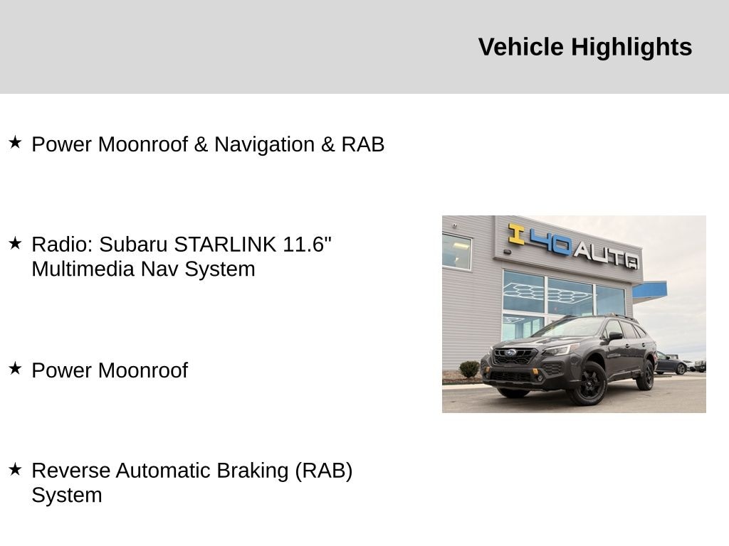 Power Moonroof & Navigation & RAB (Power Moonroof, Radio: Subaru STARLINK 11.6" Multimedia Nav System, and Reverse Automatic Braking (RAB) System), 12 Speakers, 4-Wheel Disc Brakes, 4.444 Axle Ratio, ABS brakes, Air Conditioning, Alloy wheels, AM/FM radio: SiriusXM, Auto High-beam Headlights, Auto-Dimming Exterior Mirror w/Approach Light, Auto-dimming Rear-View mirror, Automatic temperature control, Brake assist, Compass, Driver door bin, Driver vanity mirror, Dual front impact airbags, Dual front side impact airbags, Electronic Stability Control, Emergency communication system: STARLINK Safety Plus (3-year free trial), Exterior Parking Camera Rear, Four wheel independent suspension, Front anti-roll bar, Front Bucket Seats, Front Center Armrest w/Storage, Front dual zone A/C, Front fog lights, Front reading lights, Fully automatic headlights, Garage door transmitter: HomeLink, harman/kardon® Speakers, Heated door mirrors, Heated Front Bucket Seats, Heated front seats, Heated rear seats, Heated steering wheel, Illuminated entry, Knee airbag, Leather steering wheel, LED Upgrade, Low tire pressure warning, Occupant sensing airbag, Outside temperature display, Overhead airbag, Overhead console, Panic alarm, Passenger door bin, Passenger vanity mirror, Power door mirrors, Power driver seat, Power Liftgate, Power passenger seat, Power steering, Power windows, Radio: Subaru STARLINK 11.6" Multimedia Plus Sys, Rear anti-roll bar, Rear seat center armrest, Rear window defroster, Rear window wiper, Remote keyless entry, Roof rack, Security system, Speed control, Speed-sensing steering, Split folding rear seat, Spoiler, StarTex-Trimmed Upholstery, Steering wheel mounted audio controls, Tachometer, Telescoping steering wheel, Tilt steering wheel, Traction control, Trip computer, Turn signal indicator mirrors, Variably intermittent wipers, Wheels: 17" x 7J Matte Black Aluminum-Alloy, and Wireless Charger. Recent Arrival! 21/26 City/Highway MPG