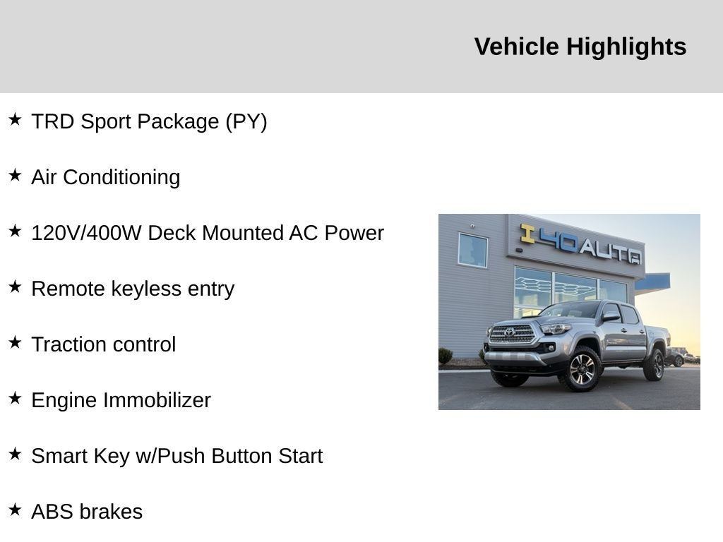 Magnetic Gray Metallic 2017 Toyota Tacoma TRD Sport V6 4WD 6-Speed Automatic V6 4WD, 120V/400W Deck Mounted AC Power, ABS brakes, Air Conditioning, Alloy wheels, Auto-Dimming Inside Rear-View Mirror w/Compass, Color-Keyed Overfenders, Compass, Cruise Control, Electronic Stability Control, Engine Immobilizer, Illuminated entry, LED Daytime Running Lights, Low tire pressure warning, Power Sliding Rear Window w/Privacy Glass, Remote keyless entry, Smart Key w/Push Button Start, Traction control, TRD Sport Package (PY), Variable Intermittent Wipers, Wide Angle Front Fog Lamps.