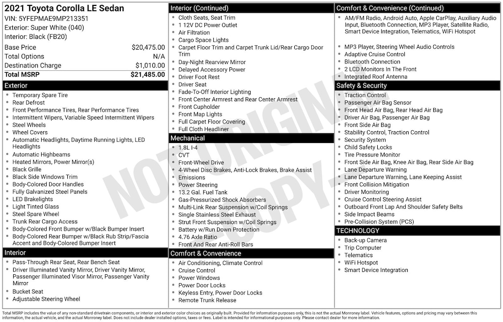 4-Wheel Disc Brakes, 6 Speakers, ABS brakes, Air Conditioning, AM/FM radio: SiriusXM, Apple CarPlay/Android Auto, Auto High-beam Headlights, Automatic temperature control, Brake assist, Bumpers: body-color, Delay-off headlights, Driver door bin, Driver vanity mirror, Dual front impact airbags, Dual front side impact airbags, Electronic Stability Control, Emergency communication system: Safety Connect with 1-year trial, Exterior Parking Camera Rear, Four wheel independent suspension, Front anti-roll bar, Front Bucket Seats, Front Center Armrest, Front reading lights, Fully automatic headlights, Illuminated entry, Knee airbag, Low tire pressure warning, Occupant sensing airbag, Outside temperature display, Overhead airbag, Panic alarm, Passenger door bin, Passenger vanity mirror, Power door mirrors, Power steering, Power windows, Premium Fabric Seat Trim, Radio data system, Radio: Audio, Rear anti-roll bar, Rear seat center armrest, Rear side impact airbag, Rear window defroster, Remote keyless entry, Security system, Speed control, Split folding rear seat, Steering wheel mounted audio controls, Tachometer, Telescoping steering wheel, Tilt steering wheel, Traction control, Trip computer, Variably intermittent wipers, and Wheels: 16" Wide Vent Steel. Recent Arrival! 30/38 City/Highway MPG