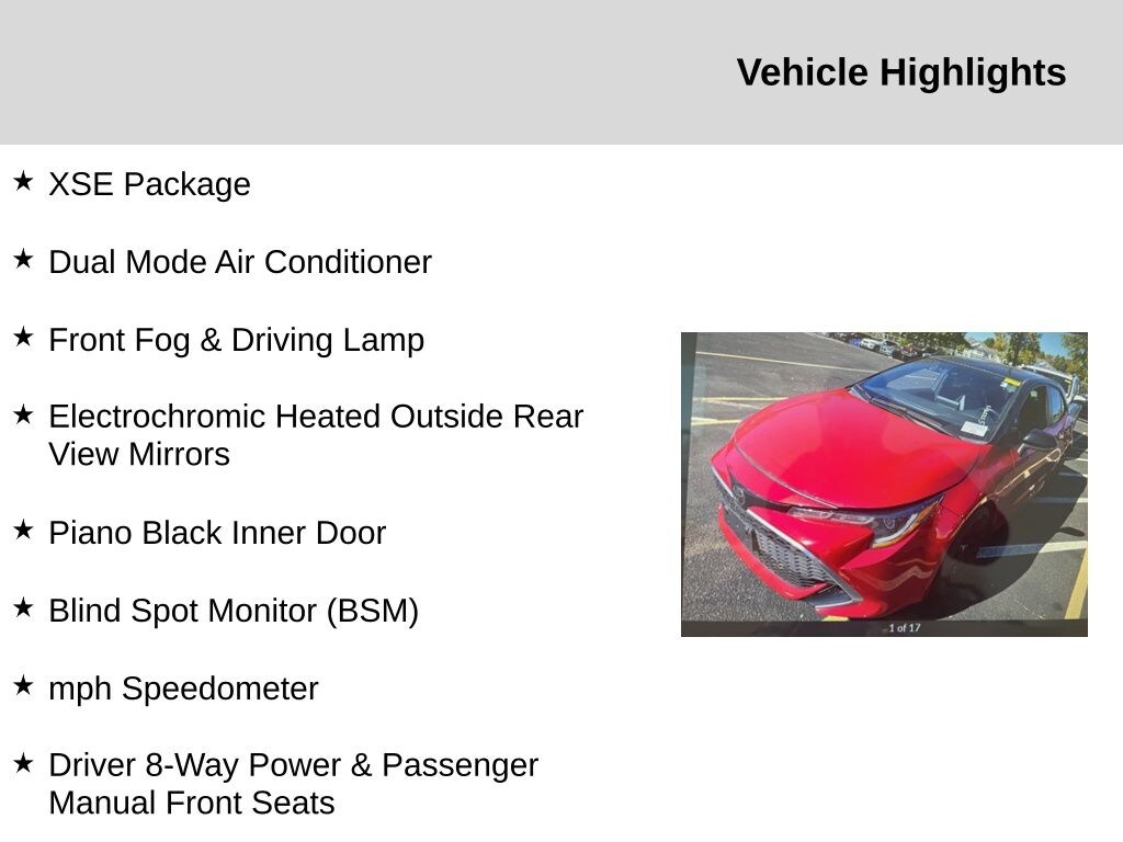 Red 2021 Toyota Corolla Hatchback XSE FWD CVT 2.0L I4 Blind Spot Monitor (BSM), Driver 8-Way Power & Passenger Manual Front Seats, Dual Mode Air Conditioner, Electrochromic Heated Outside Rear View Mirrors, Front Fog & Driving Lamp, mph Speedometer, Piano Black Inner Door, XSE Package.