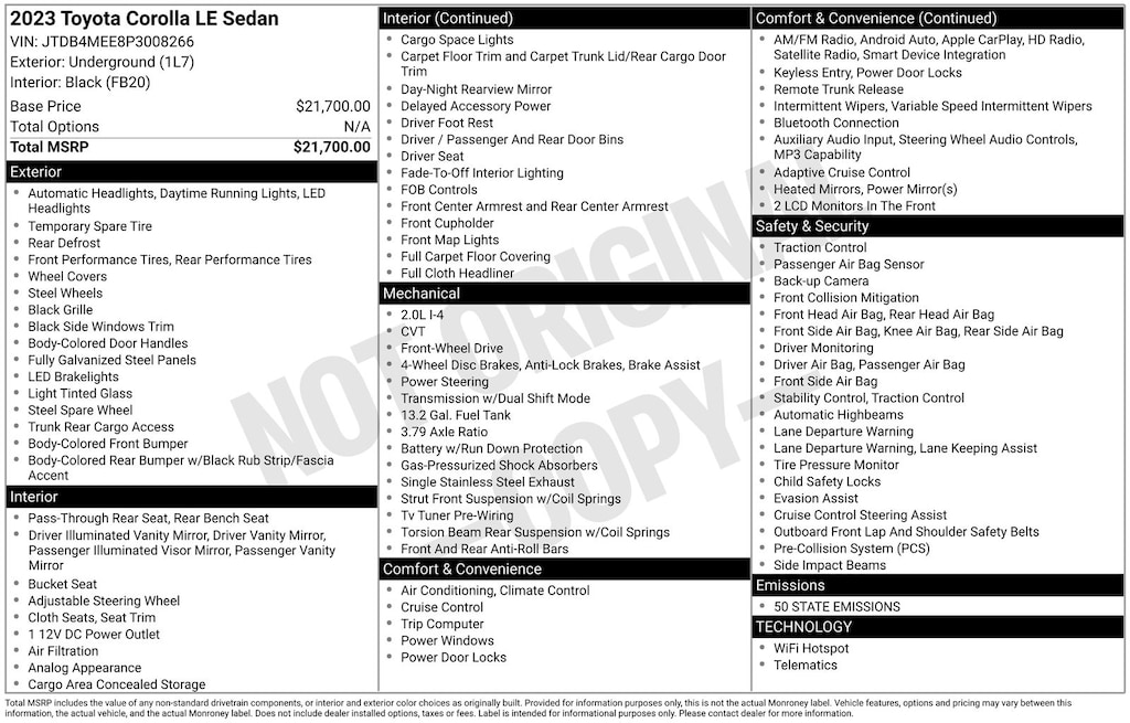 4-Wheel Disc Brakes, 6 Speakers, ABS brakes, Air Conditioning, AM/FM radio: SiriusXM, Auto High-beam Headlights, Automatic temperature control, Brake assist, Bumpers: body-color, Delay-off headlights, Driver door bin, Driver vanity mirror, Dual front impact airbags, Dual front side impact airbags, Electronic Stability Control, Emergency communication system: Safety Connect (up to 10-year trial subscription), Exterior Parking Camera Rear, Front anti-roll bar, Front Bucket Seats, Front Center Armrest, Front reading lights, Front wheel independent suspension, Fully automatic headlights, Illuminated entry, Knee airbag, Low tire pressure warning, Occupant sensing airbag, Outside temperature display, Overhead airbag, Panic alarm, Passenger door bin, Passenger vanity mirror, Power door mirrors, Power steering, Power windows, Premium Fabric Seat Trim, Radio data system, Radio: 8" Toyota Audio Multimedia, Rear anti-roll bar, Rear seat center armrest, Rear side impact airbag, Rear window defroster, Remote keyless entry, Speed control, Split folding rear seat, Steering wheel mounted audio controls, Tachometer, Telescoping steering wheel, Tilt steering wheel, Traction control, Trip computer, Variably intermittent wipers, and Wheels: 16" Wide Vent Steel. Recent Arrival! 32/41 City/Highway MPG