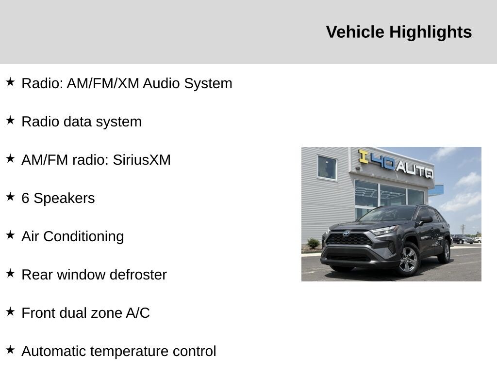 Charcoal 2023 Toyota RAV4 Hybrid LE AWD eCVT 2.5L 4-Cylinder 2.5L 4-Cylinder, 4-Wheel Disc Brakes, 6 Speakers, ABS brakes, Air Conditioning, Alloy wheels, AM/FM radio: SiriusXM, Auto High-beam Headlights, Automatic temperature control, Axle Ratio: TBD, Brake assist, Bumpers: body-color, Driver door bin, Driver vanity mirror, Dual front impact airbags, Dual front side impact airbags, Electronic Stability Control, Emergency communication system: Safety Connect (1-year trial), Exterior Parking Camera Rear, Fabric Seat Trim, Four wheel independent suspension, Front anti-roll bar, Front Bucket Seats, Front Center Armrest, Front dual zone A/C, Front reading lights, Front Sport Seats, Illuminated entry, Knee airbag, Lane Departure Warning System, Low tire pressure warning, Occupant sensing airbag, Outside temperature display, Overhead airbag, Overhead console, Panic alarm, Passenger door bin, Passenger vanity mirror, Power door mirrors, Power steering, Power windows, Radio data system, Radio: AM/FM/XM Audio System, Rear anti-roll bar, Rear seat center armrest, Rear window defroster, Rear window wiper, Remote keyless entry, Speed control, Speed-sensing steering, Split folding rear seat, Spoiler, Steering wheel mounted audio controls, Telescoping steering wheel, Tilt steering wheel, Traction control, Trip computer, Wheels: 17" x 7.0J Silver Aluminum Alloy.