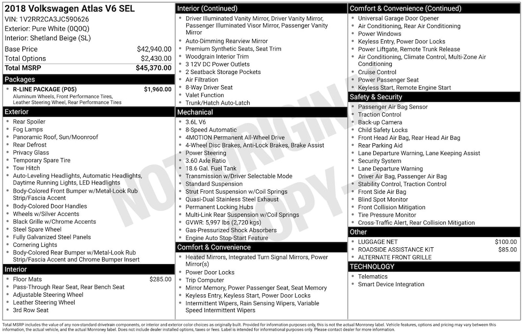 (Warning- a little long) We were looking for a roomy 3 row SUV with easy access to all 3 rows. After a ton of research and multiple test drives of the possible options, we settled on the VW Atlas, SEL Premium. We’ve owned our Atlas for a little over a month now. We’ve taken it on a couple of long trips (1000+ miles), so we’ve seen enough to write a decent review. The Atlas was one of 4 finalists for us. The others were the GMC Acadia, the Chevy Traverse, and the Infiniti QX60. These were our finalists for one primary reason- access to the rear seat with car seats installed in the middle row seats (without climbing into the middle row, and going through the middle space between the captain’s chairs). No other 3 row SUVs had this option, although I understand some will have it for the 2020 model year. Because we only had 4 models to look at, we focused all our attention on these models. Likes: Third row access is incredibly easy in the Atlas. By pulling up on the release on the top of the seat, the entire seat tips forward, and then slides forward, leaving a large opening to access the rear seat, and allowing us to buckle our 4 year old into that seat very easily, even while standing outside the car. This middle row seat movement can be performed with a car seat installed in the middle row seats, a maneuver that very few 3 row SUVs are capable of. The Infiniti QX-60 has a similar setup, and it is just as easy to use. The Acadia and Traverse also have this option, but during our test drives, we found the mechanism to be incredibly difficult to use. The salesman said it was probably just stiff, but it was almost impossible for my wife to get the seat to move, and it happened in both of those models. Also, the GMC and Chevy only have this capability on the passenger side, which is highly annoying. The interior of the Atlas is HUGE, the door openings are very wide to provide easy access, and it is very comfortable. The seats in the Atlas were by far the most comfortable of any vehicle we tested. When I say that, I mean ALL of the seats, to include the 2nd and 3rd rows, and the 3rd row is actually usable by adults. I am 5’10”, and I was very comfortable back there. I would not say the same of the other three vehicles tested. Also, the middle row seats of the Chevy and GMC were very uncomfortable. The had a weird shape, with a weird forward “hump” that hit right between the shoulder blades. I’m sure this has something to do with crash safety or something like that, but those seats were just extremely uncomfortable. Our Atlas is equipped with a panoramic sunroof, which is pretty cool. It also has a power sunshade for the sunroof. The Chevy and GMC have a very cheap, manual cover. It is spring-loaded, and if you accidentally let go of it, it will snap back like a window shade. At this price level, it should be a power sunshade. While we are on the topic of sunshades: the 2nd row windows in the Atlas have built-in sunshades, which is ingenious! I wish all cars had this feature. The Atlas has an infotainment system that is easy to use and intuitive, and it allows for swiping and pinch zooming. Apple Car Play is awesome! Surprisingly, some manufacturers have not integrated this feature at this time. The digital instrument panel has a very nice, modern look, and it offers 5 or 6 different views. One of the really cool things about the Atlas- you can display the nav map in the middle of the instrument panel. Additionally, you can make the map bigger and the gauges smaller, which allows you to see more map detail- a really nice option. The car even has an altimeter, which is really cool to me (I’m a pilot by trade). Not so much for my wife… The Atlas allows for 4 customizable driver settings. It also has an overhead view camera, which allows you to see a birds-eye view of the vehicle- very handy to ensure you are actually centered in that parking spot! (this is only offered in the highest trim level) The car also has a traditional shift lever. This appeals to me, because I’m old school. The Atlas has a very nice exterior, and it looks great from both the front and the back. The LED headlights are really nice, and much brighter than standard headlights. Also, the daytime running lights look really cool (I noticed that when another Atlas pulled up behind us on the freeway). It also has a small turn radius, which makes maneuvering in tight spaces much easier. The Atlas has a few other really nice options- adaptive cruise control, auto-dimming headlights, auto-wipers, and an auto-park feature (highest trim level only) for parallel and back in perpendicular parking. The cruise control also has an option to speed up or slow down in increments of 5 mph in addition to the more standard 1 mph increment, which is handy. It also has a feature that turns on the fog light on the side of the car in the direction of a turn, providing extra light for making the turn safely. You can also lock the middle row seat HVAC controls, to prevent the inevitable arguments from the kiddos! One of the best things about the Atlas is the industry leading warranty- 6 years/72k miles, bumper to bumper. Very few of the competitors even come close to this. And it is manufactured in the USA, which I really like. Now let’s talk about the things I don’t like about the car. (And believe me when I say these things are pretty minor in the grand scheme of things…) The biggest gripe I have is the engine power. Given that my primary goal with this vehicle is to comfortably get a lot of people from point A to B, this isn’t a huge deal. I didn’t buy this car to qualify for the Indy 500, but I do wish VW offered some different engine options, like a V-8 or a turbo V-6. They do offer a turbo 4 cylinder, but it is not offered above the base trim level, and I don’t think it is anything more than adequate for this car anyway. A close 2nd for cons would be the height of the front seat armrests (on the door side of each