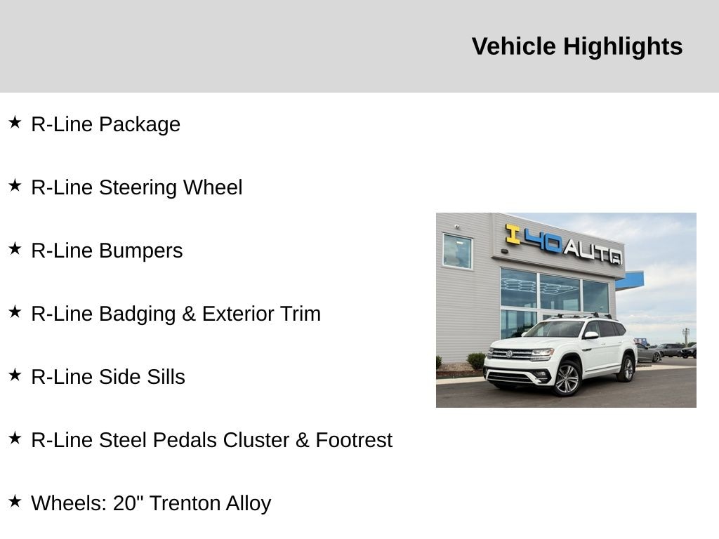 3.60 Axle Ratio, 3rd row seats: split-bench, 4-Wheel Disc Brakes, 8 Speakers, ABS brakes, Air Conditioning, Alloy wheels, AM/FM radio: SiriusXM, Auto-dimming Rear-View mirror, Automatic temperature control, Brake assist, Bumpers: body-color, Compass, Delay-off headlights, Driver door bin, Driver vanity mirror, Dual front impact airbags, Dual front side impact airbags, Electronic Stability Control, Emergency communication system: VW Car-Net, Exterior Parking Camera Rear, Four wheel independent suspension, Front anti-roll bar, Front Bucket Seats, Front Center Armrest, Front dual zone A/C, Front fog lights, Front reading lights, Garage door transmitter: HomeLink, Heated door mirrors, Heated Front Bucket Seats, Heated front seats, Illuminated entry, Low tire pressure warning, Memory seat, Occupant sensing airbag, Outside temperature display, Overhead airbag, Overhead console, Panic alarm, Passenger door bin, Passenger vanity mirror, Power door mirrors, Power driver seat, Power Liftgate, Power moonroof, Power passenger seat, Power steering, Power windows, Radio data system, Radio: Composition Media 8.0" Touchscreen w/CD, Rain sensing wipers, Rear air conditioning, Rear anti-roll bar, Rear reading lights, Rear seat center armrest, Rear window defroster, Rear window wiper, Remote CD player, Remote keyless entry, Roof rack: rails only, Security system, Speed control, Speed-sensing steering, Split folding rear seat, Spoiler, Standard Suspension, Steering wheel mounted audio controls, Tachometer, Telescoping steering wheel, Tilt steering wheel, Traction control, Trip computer, Turn signal indicator mirrors, V-Tex Leatherette Seating Surfaces, Variably intermittent wipers, and Wheels: 18" Prisma Alloy. Recent Arrival!