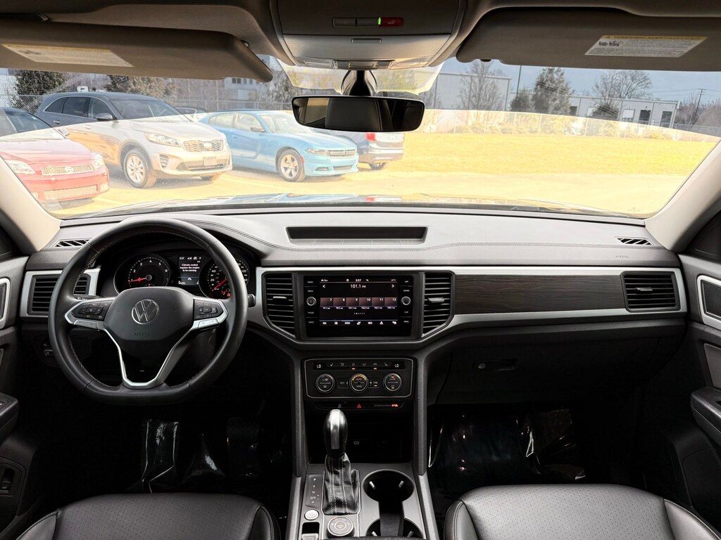 3.60 Axle Ratio, 3rd row seats: split-bench, 4-Wheel Disc Brakes, 6 Speakers, ABS brakes, Active Blind Spot Monitor, Air Conditioning, Alloy wheels, AM/FM radio: SiriusXM, Auto-dimming Rear-View mirror, Automatic temperature control, Brake assist, Bumpers: body-color, Compass, Delay-off headlights, Driver door bin, Driver vanity mirror, Dual front impact airbags, Dual front side impact airbags, Electronic Stability Control, Emergency communication system: VW Car-Net services (capabilities require enrollment or subscription), Exterior Parking Camera Rear, Forward collision: FCW w/Autonomous Emergency Braking mitigation, Four wheel independent suspension, Front anti-roll bar, Front Bucket Seats, Front Center Armrest, Front dual zone A/C, Front fog lights, Front reading lights, Fully automatic headlights, Heated Comfort Front Bucket Seats, Heated door mirrors, Heated front seats, Illuminated entry, Leather Shift Knob, Low tire pressure warning, Occupant sensing airbag, Outside temperature display, Overhead airbag, Overhead console, Panic alarm, Passenger door bin, Passenger vanity mirror, Perforated V-Tex Leatherette Seating Surfaces, Power door mirrors, Power driver seat, Power Liftgate, Power steering, Power windows, Radio data system, Radio: Composition Media w/8" Touchscreen, Rain sensing wipers, Rear air conditioning, Rear anti-roll bar, Rear reading lights, Rear seat center armrest, Rear window defroster, Rear window wiper, Remote CD player, Remote keyless entry, Roof rack: rails only, Security system, Speed control, Speed-sensing steering, Split folding rear seat, Spoiler, Standard Suspension, Steering wheel mounted audio controls, Tachometer, Telescoping steering wheel, Tilt steering wheel, Traction control, Trip computer, Turn signal indicator mirrors, Variably intermittent wipers, and Wheels: 20" 5-Spoke Silver Alloy. Recent Arrival!